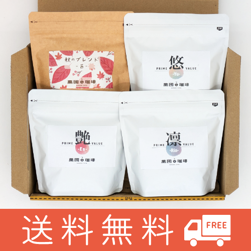 プライムバリュー3種類と季節のブレンドのセットを、送料無料でご用意しました。お悩みの方は、ぜひこちらをお試しくださいませ。